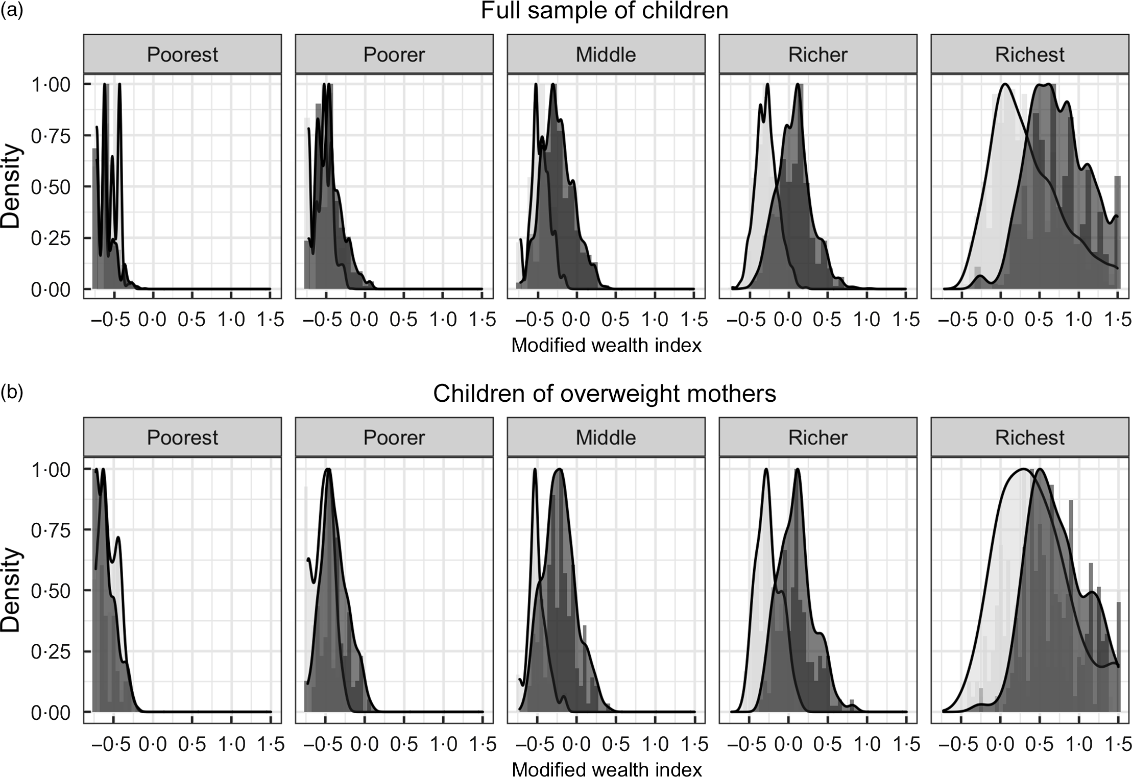 Fig. 1 Distribution of wealth indices by wealth quintiles and period among (a) the full sample of children. Period 2000–2005; 2010–2014 and (b) the subsample of children of overweight mothers.