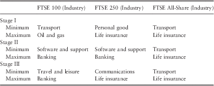 Table 10 shows the highest and lowest scoring industry sectors within each category of market capitalisation for the 2013 financial year. The financial sector comprises three industries such as banking, insurance and life insurance, which are subject to stringent disclosure regulations. Consequently, this sector shows the highest average scores in each of the three stages and across all company sizes except at stage I for FTSE 100, which was led by the oil and gas industry. In contrast, the transport industry (categorised as part of the “other” sector), received the lowest scores at all stages across most firm sizes. Although we would generally expect to witness higher disclosure scores for FTSE 100 firms than FTSE 250 or FTSE All-Share, the results showed variation across different industries. For instance, the banking industry showed higher disclosure scores for larger firms (FTSE 100), while the software and support industry showed lower disclosure scores for larger firms. The services sector poor disclosure score stems from its low scoring firms in software and support and travel and leisure.