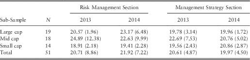 For our sub-samples of companies, the large-cap companies on average are more than 16 times larger market capitalisation than mid-cap firms, which in turn are more than six times larger than small-cap firms. In terms of market data, the book to market ratio for small-cap firms is relatively higher than for either mid-cap or large-cap firms. By contrast, the standard deviation of stock returns for large-cap firms is significantly higher than for either mid-cap or small-cap firms. These statistics imply that, for at least our sample of UK firms during the study period 2013–2015, firm size is negatively associated with both (a) the extent to which the market’s assessment of the extent to which current and future equity value (i.e. “intrinsic value”) is captured by past-oriented accounting book value and (b) total firm risk. Consequently, more effective communication of risk management, risk culture and corporate strategy are likely to be particularly important to larger sized firms, in influencing the stock market’s relatively more negative assessment of both their total intrinsic value and firm risk.