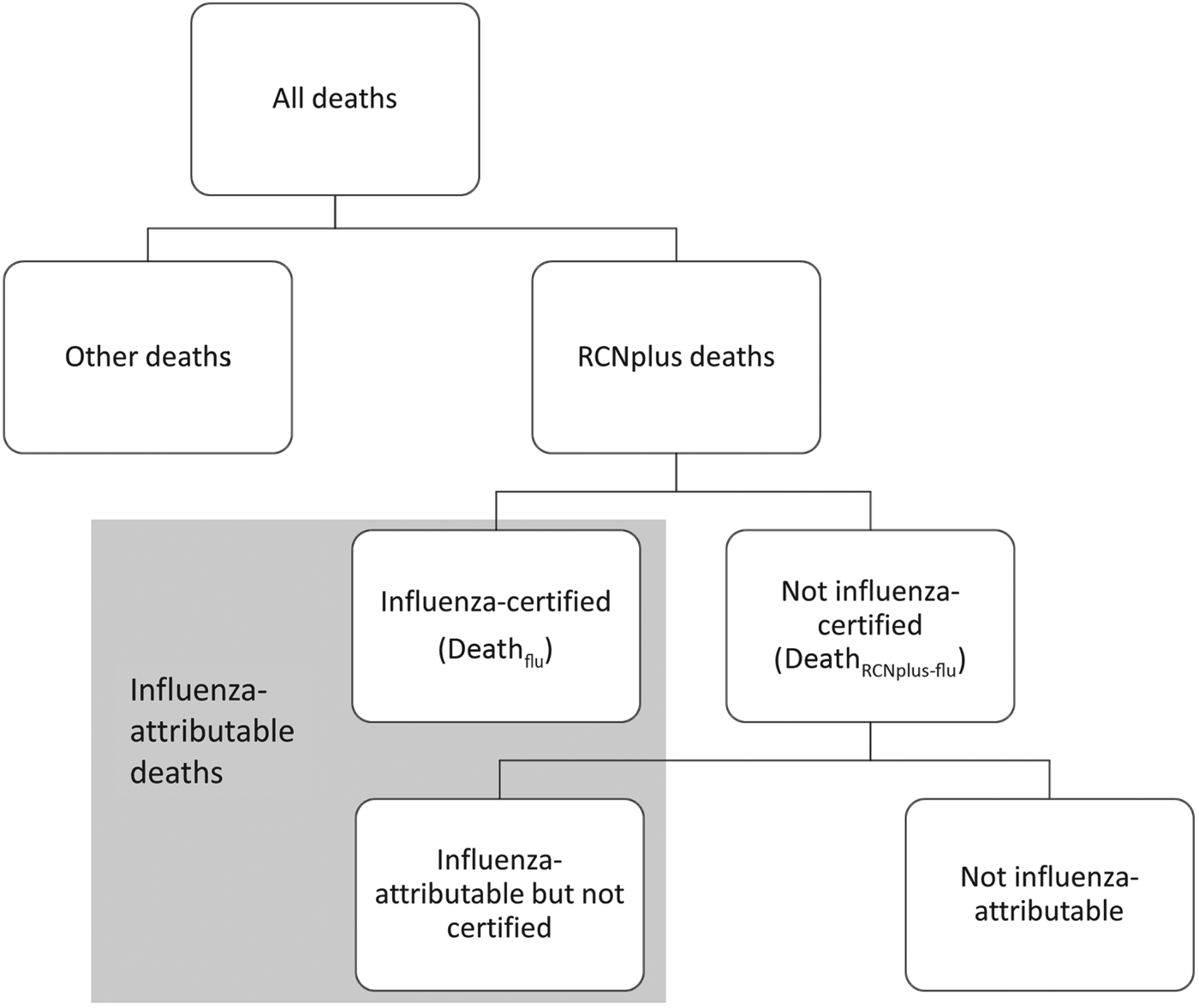 Fig. 1. Categorization of paediatric deaths. RCNplus deaths are those with respiratory, circulatory, neurological, sepsis, or other/unspecified viral illness as underlying cause of death; influenza-certified deaths are those where influenza is listed as an underlying or contributing cause of death. Deathflu includes those during the pandemic period (DeathfluP) and non-pandemic seasons (DeathfluNP).