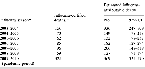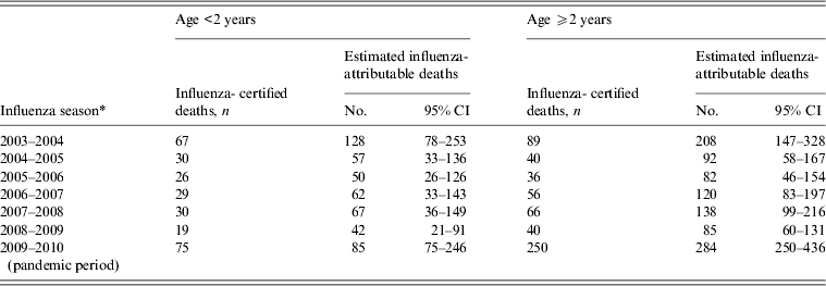 Table 2. Paediatric influenza-certified and estimated influenza-attributable deaths by influenza season and age group, United States, 2003–2004 to 2009–2010