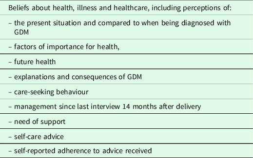 A semi-structured interview guide with open-ended questions was used. Initially, standardised questions on medical and socio-demographic data were posed. The interview guide was developed based on a previous study (Hjelm et al., Reference Hjelm, Bard and Apelqvist2012a), review of the literature and peer-review by diabetes specialist nurses, midwives and diabetologists managing women with GDM. Themes explored are presented in Table 1. The interview had a retrospective perspective with a focus on reflections on how to maintain health and were held by an external specialist nurse (second author) not involved in the management of the women or in the studied clinic. An authorised female interpreter was used, and the sequential interpretation technique with interpreting word for word was applied as recommended in Sweden (Hadziabdic & Hjelm, Reference Hadziabdic and Hjelm2013; Kammarkollegiet, 2016). The interviews were held outside the clinic, in secluded rooms, lasted about 1.5 h, were recorded and transcribed literally. The texts were coherent and without non-translated parts.
