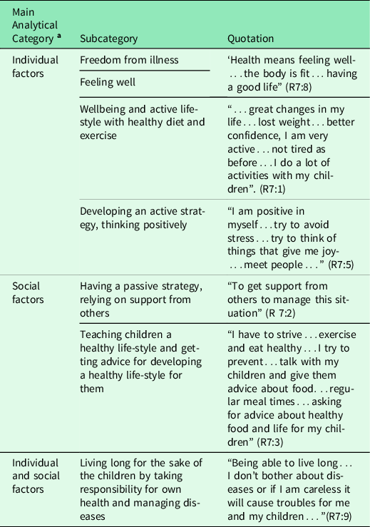Health seven years after delivery was described as being free from illness, feeling well and living long for the sake of the children by taking responsibility for one’s own health and managing diseases in the best possible way (individual and social factors; Table 2):