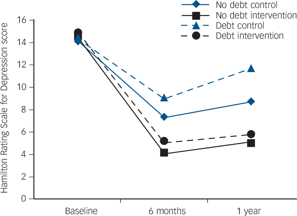 FIG. 2 Hamilton Rating Scale for Depression Score at baseline, 6 months and at follow-up for intervention and control groups, split by debt v. no debt.