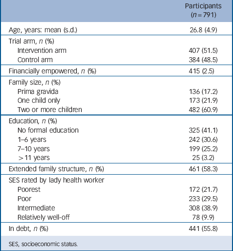 The recruitment to the trial has been described in detail elsewhere. Reference Rahman, Malik, Sikander, Roberts and Creed1 Out of 3898 women in the last trimester of pregnancy, 3518 consented to baseline screening with the SCID and 903 eligible women had a DSM-IV major depressive episode and consented to join the trial. These women received the intervention or enhanced routine care according to the union council in which they lived and they were followed up for 1 year postnatally. This study is concerned with 791 women who completed the 1-year follow-up with complete data; details of the sample are shown in Table 1.