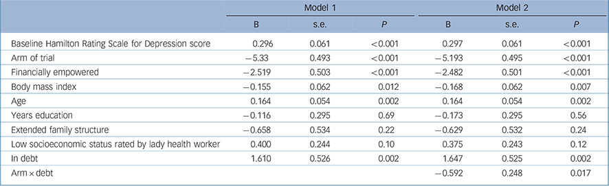We used two-way analysis of covariance (ANCOVAR) to test for the effects of treatment arm, being in debt or not, and the interaction term arm × debt on the follow-up HRSD score. We adjusted for baseline HRSD, mother's age, BMI, years of education, family structure, and socioeconomic status rated by the LHW. This analysis was repeated for financial empowerment instead of debt.