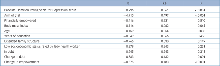 All analyses were carried out with SPSS for Windows, version 16. The first analysis (data not shown) included all the participants in the trial for whom complete data were available at 1-year follow-up (n = 791). These initial univariable analyses were performed to identify baseline variables associated with HRSD scores at follow-up and used t-test, analysis of variance (ANOVA) or correlation as appropriate. We then performed multiple regression analyses with follow-up HRSD score as the dependent variable. The independent variables were: baseline HRSD, arm of trial (intervention or control), the participant's age, BMI, duration of formal education, family structure (nuclear or joint), socioeconomic status rated by the LHW, empowerment (whether the woman was empowered to manage household finances or not), and debt (yes/no).