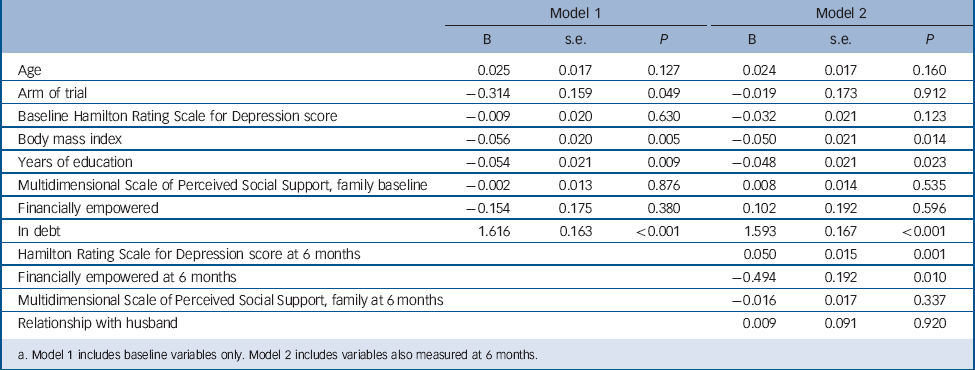 When 6-month follow-up assessments were added to the logistic regression (model 2) it is clear that debt at follow-up was associated with baseline debt, few years of education, BMI, HRSD score at 6 months and mother not financially empowered at 6 months (Table 4).
