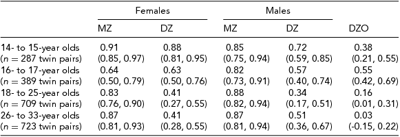 TABLE 3 Polychoric Correlations for Cigarette Quantity (95% CI) by Sex, Zygosity, and Age Group