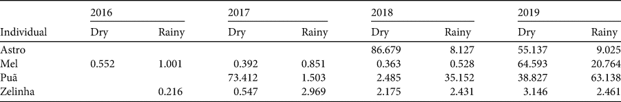 Locations were visualized using QGIS 3.10 (QGIS Development Team, 2019), resulting in the identification of the main areas used by each individual monitored, in the dry and rainy seasons. We used the Home Range tool in QGIS to calculate the areas of use, defining an animal's home range as the area containing 95% of the locations obtained; this excludes sporadic displacements that are not considered as part of the individual's home range (Normande et al., Reference Normande, Malhado, Reid, Viana, Savaget and Correia2016). We had sufficient data to calculate home ranges in the dry and rainy seasons for four individuals: Astro, Mel, Puã and Zelinha.
