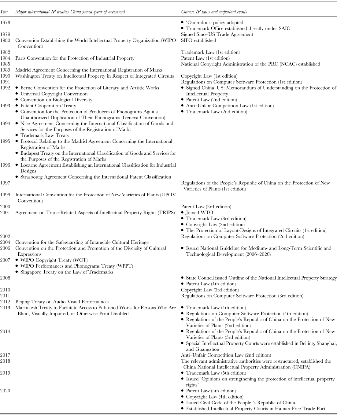 In 1978, an ‘open-door’ policy was adopted in China, which gradually transformed the planned economy system operating in China for 30 years into a market economy system. In order to support this transformation of the economic system, China joined a series of international conventions and treaties for intellectual property rights (IPR) protection and established its own IPR legal system. China signed the World Intellectual Property Organization (WIPO) Convention in 1980, and on December 11, 2001, China was accepted as a member of the World Trade Organization (WTO). As a compulsory requirement for becoming a member of the WTO, China had to improve its IPR system to comply with the minimum standards of the Agreement on Trade-Related Aspects of Intellectual Property Rights (TRIPS) (Keupp, Beckenbauer, & Gassmann, Reference Keupp, Beckenbauer and Gassmann2009; Li & Yu, Reference Li and Yu2015; Lin, Reference Lin2017). Patent Laws, Trademark Laws, and Copyright Laws were all revised, and several other IPR-related laws and regulations were issued during this period. Improvements to Chinese IPR laws during this period were to satisfy the TRIPS Agreement, as well as to meet other international standards (Alimov, Reference Alimov2019; Gao, Reference Gao2008; Zimmerman, Reference Zimmerman2013).