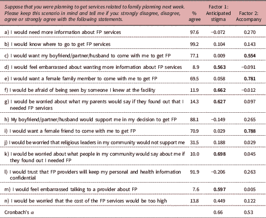 Responses on each of the fourteen items were recoded as binary variables: 1 for agree and strongly agree and 0 otherwise. The percentage of respondents who agreed with each item in addition to the factor loadings are presented in Table 2. Two factors formed: 1) anticipated stigma, which included measures related to worry, fear and embarrassment; and 2) desire to be accompanied to a facility for FP services. The second factor was explored in the analysis but was excluded from the results because of the low α score and lack of significant relationships.