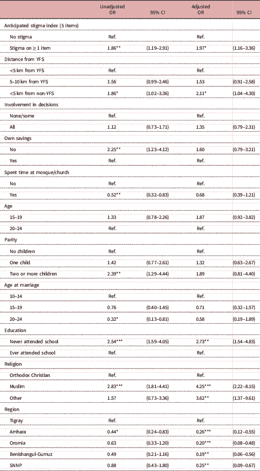 The results of this study show that among married female youth in Ethiopia, anticipated stigma is significantly associated with an unmet need for voluntary family planning. This effect remains significant after adjusting the association for other known barriers to FP use, including proximity to a YFS facility. The anticipated stigma measures include embarrassment discussing contraceptives with providers, worry about parental or other community members’ attitudes towards married youth who need FP and fear of being seen when accessing contraceptive services. These issues stem from broader social and community-level opinions of married girls’ use of contraceptives. In Ethiopia, where early marriage remains deeply rooted in tradition and pressures to demonstrate fertility are high, the ability to access FP/RH services and make decisions about ones’ own health is still limited, and the reproductive health of married girls and young women can suffer as a result (Shaw, Reference Shaw2009). It is therefore critical that efforts to increase access to FP/RH services are comprehensive, including interventions to delay the age at marriage and increase the autonomy of married girls and young women (Erulkar et al., Reference Erulkar, Medhin and Weissman2017).