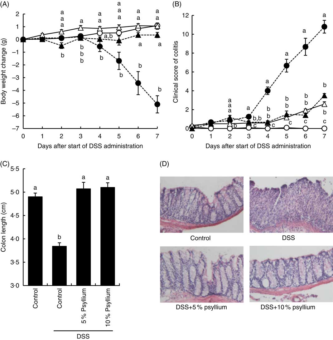 , DSS+10 % psyllium. a,b,c Mean values with unlike letters were significantly different from each other (P<0·05).
