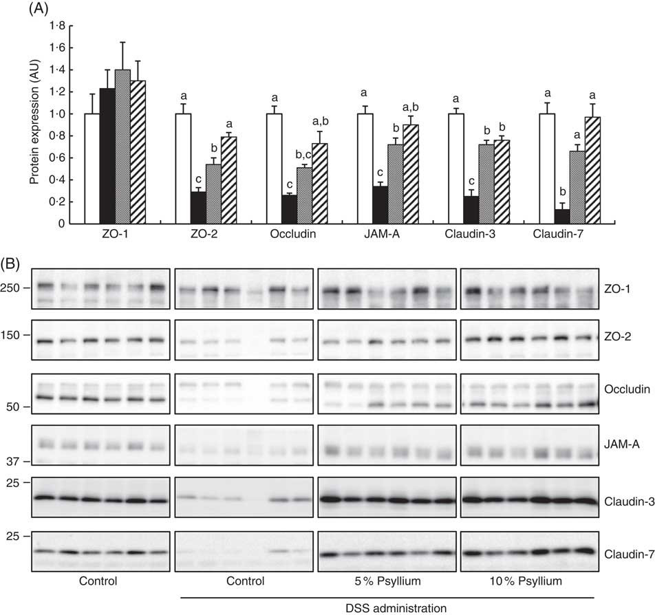 Fig. 5 Effects of psyllium fibre consumption on tight junction (TJ) protein expression in the colons of dextran sodium sulphate (DSS)-administered mice. (A) Protein expression of zonula occludens (ZO)-1, ZO-2, occludin, the junctional adhesion molecule (JAM)-A, claudin-3 and claudin-7 were determined by immunoblot analysis in the colons of mice fed diets with and without 5 and 10 % psyllium fibre, with and without DSS administration. (B) Immunoblot images of TJ proteins are shown. Values are means (n 6), with their standard errors represented by vertical bars. □, Control; ■, DSS;