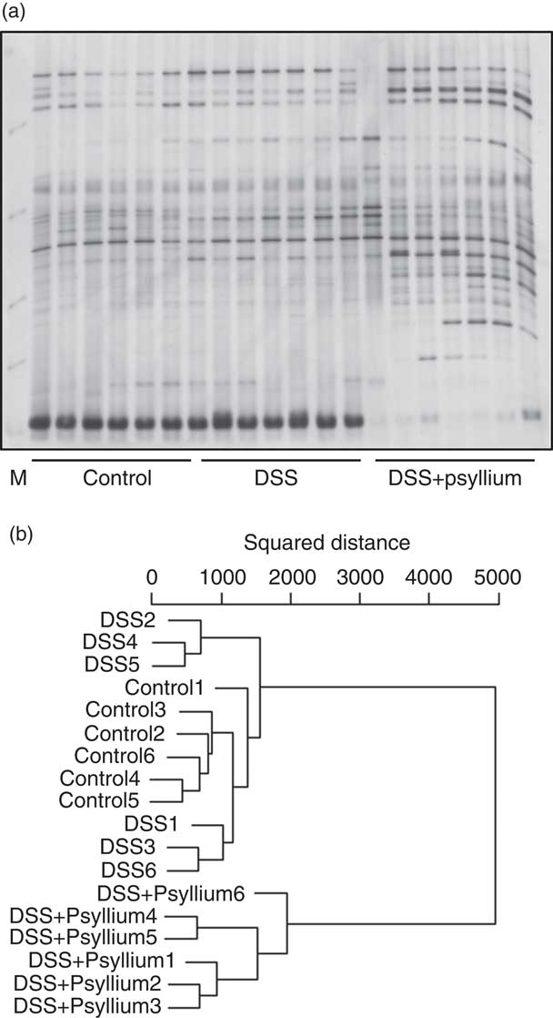 Fig. 8 Effects of psyllium fibre consumption on faecal microbiota based on 16S rRNA gene sequences in dextran sodium sulphate (DSS)-administered mice. Denaturing gradient gel electrophoresis (DGGE) gel image (a) and dendrogram (b) of DGGE band profiles 4 d after the start of DSS administration. Each lane in the gel image and each line in the dendrogram represents individual mice. The squared distances between the two clusters were measured by Ward’s method. M, size marker.