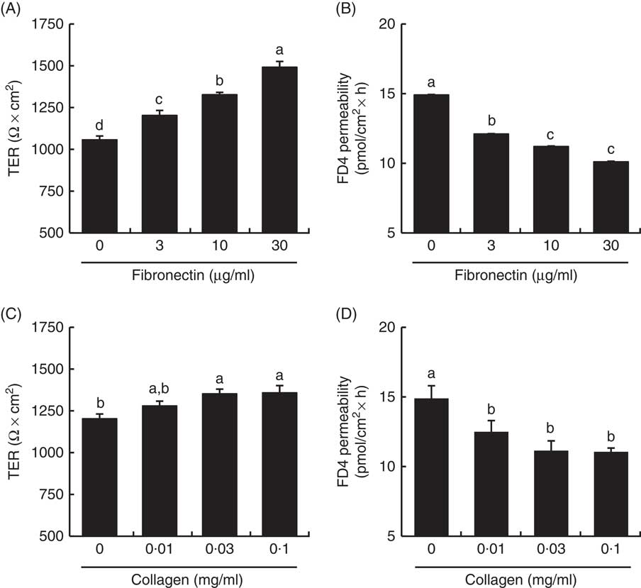 Fig. 9 Effect of collagen and fibronectin on barrier integrity in intestinal Caco-2 cells. Caco-2 cells were grown on membrane filter supports pre-coated with fibronectin (A, B) and collagen (C, D). The barrier integrity was evaluated by transepithelial electrical resistance (TER) (A, C) and fluorescein isothiocyanate (FITC)-conjugated dextran (FD4) permeability (B, D). Values are means (n 6), with their standard errors represented by vertical bars. a,b,c,d Mean values with unlike letters were significantly different from each other (P<0·05).