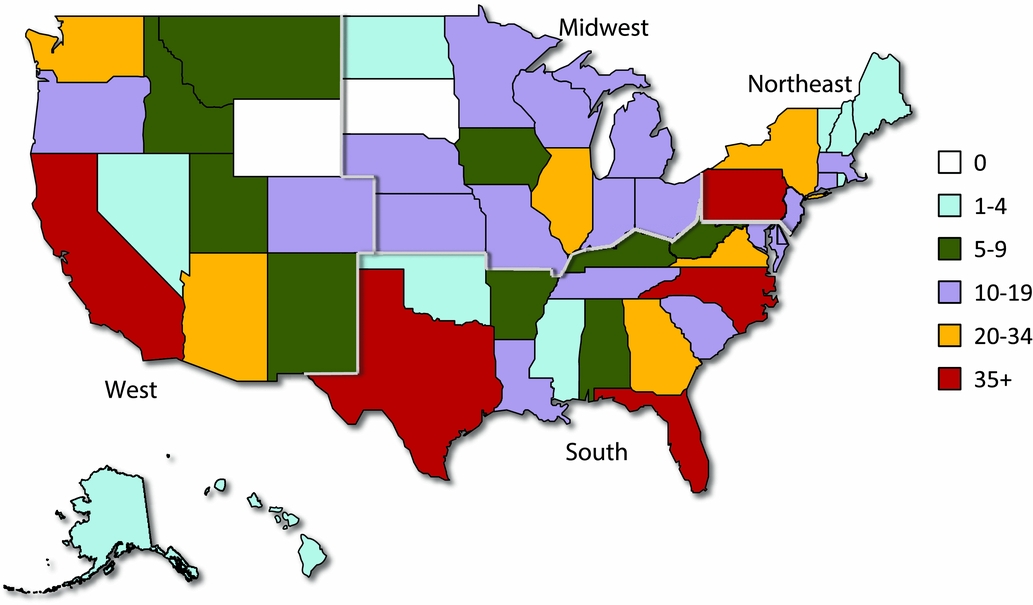 In terms of practice locations for the survey practices reporting onsite MRI capacity, as might be expected, more of the MRI practices in the survey sample tend to be located in more populous states (California, Texas, Florida) with none or few MRI practices in sparsely populated states (Wyoming, North Dakota, Maine), but the pattern does not consistently follow state population, as shown in Figure 2.