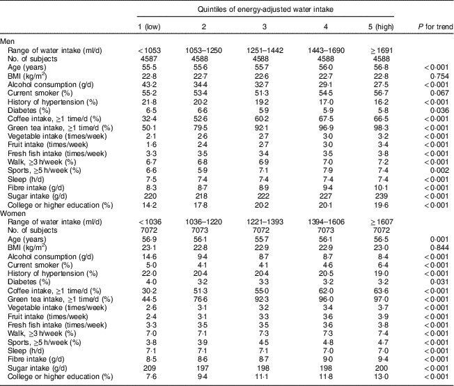 Table 1 Age-adjusted baseline risk characteristics according to water intake from foods and beverages among 22 939 men and 35 362 women aged 40–79 years, Japan Collaborative Cohort (JACC) Study