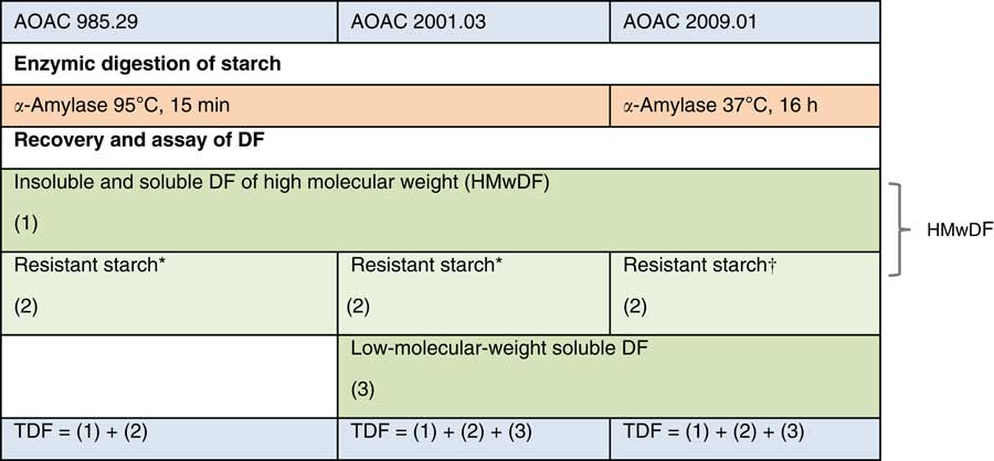 Fig. 2 Main Association of Official Analytical Chemists International (AOAC) methods for total dietary fibre (TDF) analysis (adapted from Bar-L’Helgouac’h et al. ( Reference Bar-L’Helgouac’h, Barron and Saulnier 197 )). * Method quantifies part of resistant starch (RS). † Method quantifies all RS. DF, dietary fibre.
