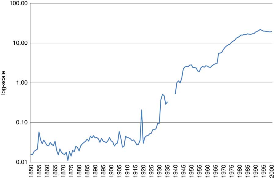 FIGURE 1 SPANISH PUBLIC SOCIAL SPENDING (PER CENT OF GDP), 1850-2000 Source: Espuelas (Reference Espuelas2013). The Appendix reports the data without the log-scale. The series includes social spending by the Spanish central government, the autonomous communities, and the Social Security benefits. Municipal and provincial social spending has been excluded, because they have many gaps; fewer than 90 observations are available. Moreover, the series are not cointegrated when we use this smaller and discontinuous sample. Nonetheless, excluding local social spending should not mean a significant change, as Spanish social insurance development was the sole responsibility of the central government (and the autonomous communities after their creation). Following Lindert (Reference Lindert2004), civil servants’ pensions have also been excluded. Instead of reflecting a turning point in the state’s general social protection policies, these are rather the result of the particular employment relation between the state and its employees, so that the political economy behind them might be different. The main results hold when civil servants’ pensions are included (although some interesting patterns for the period before 1931 are hidden, see footnote 14). Results are available upon request.