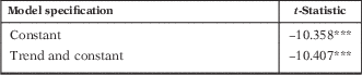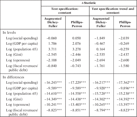 Since the analysis involves time series, before moving on to the regression analysis, we first tested whether or not the series are stationary. The augmented Dickey-Fuller test and the Phillips-Perron test were applied to the series included in the model. The results indicate that all of them are integrated series of order one, I (1) (Table 1). We then tested whether the series are cointegrated. The Engle-Granger cointegration test was applied to the residuals of the ordinary least squares (OLS) estimation in Table 3. The results confirm that the series are cointegrated (see Table 2). When the series are cointegrated, the OLS estimator is consistent, but it presents problems of asymptotic bias and is not an efficient estimator. In order to give robustness to the analysis, in addition to the least squares estimation, I have also reported the results using dynamic least squares and fully modified least squares. Both of these methods can deal with possible problems deriving from the existence of a cointegration relation. The first method does so by including lags and leads of the stochastic regressors in differences, while the second uses a semi-parametric correction of the least squares estimator (Phillips and Hansen Reference Phillips and Hansen1990; Stock and Watson Reference Stock and Watson1993). Both estimators are equivalent and asymptotically efficient.