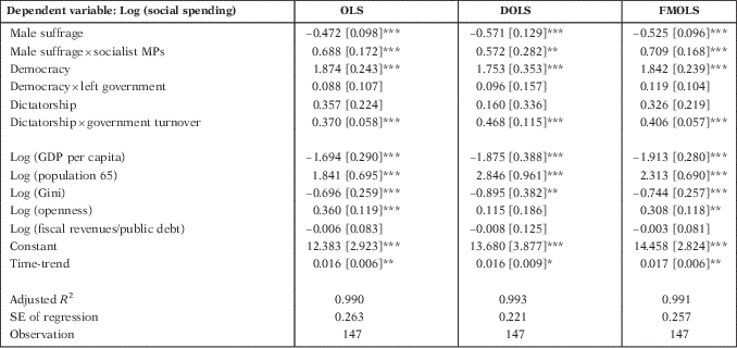 Regarding the results, the size and sign of the coefficients of the variables of interest are similar to those in Table 3. Democracy has a positive and highly significant effect on social spending; universal male suffrage (in a not fully democratic context) has an initially negative effect that becomes easily offset by the socialist party’s parliamentary seats, and dictatorship has no statistically significant effect. The IV results, therefore, confirm Table 3’s results. Indeed, according to the Durbin-Wu-Hausman endogeneity test, there is no evidence to reject the null hypothesis that the regressors are exogenous. This is not entirely surprising. As noted earlier, high and low social spending levels occurred both under democratic and non-democratic regimes.