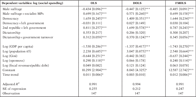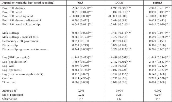 Notes: All regressions include a time dummy for the post-Spanish-civil-war period. Espuelas (Reference Espuelas2013) warns that there is a jump in his social spending series in 1967 due to problems in the original sources. To control for it, I have included a time-dummy for the time period after that year. The main results remain when these time-dummies are removed, although the general fit of the regressions decreases.