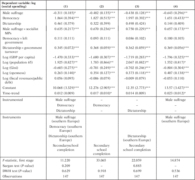However, one potential concern when analysing the relation between the political regime and social spending arises with the possible issue of endogeneity. Since social spending contributes to political stability, it might influence the type of political regime. Also, if redistribution demands are high, high-income groups may prefer non-democratic regimes (Boix Reference Boix2003). Both cases would raise an issue of inverse causality. There might also be a problem of omitted variables affecting the coefficients of the variables of interestFootnote 14 . To make the analysis more robust, the estimations in Table 3 have been repeated, but this time using instrumental variables. The results appear in Table 5. As instruments for the political regime (which, in this case, are three variables: democracy, dictatorship and universal male suffrage), I have used the percentage of the working-age population that has completed secondary education and the type of political regime (democracy, dictatorship and universal male suffrage) in other southern European countries: Italy, Greece and PortugalFootnote 15 . In column 1, I have instrumented simultaneously for the three variables relating to political regime (democracy, dictatorship and universal male suffrage). In columns 2 through 4, I have instrumented for each of these variables individually (the instrument used for democracy has been democracy in southern Europe and the completion rate for secondary education; for dictatorship, dictatorship in southern Europe and the completion rate for secondary education; and for male suffrage, completion rate for secondary education and male suffrage in southern Europe). In all of the regressions (from columns 1 to 4), a redundancy test has been applied. The instruments that did not pass the test were eliminated from the regressions.