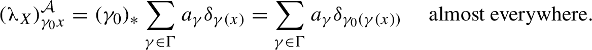 Since every $\gamma _0\in \Gamma $ preserves $ \unicode{x3bb} _X$ and $\mathcal {A}$ , it follows that $(\unicode{x3bb} _{X})_{\gamma _0 x}^{\mathcal {A}}=(\gamma _0)_*(\unicode{x3bb} _{X})_x^{\mathcal {A}}$ almost everywhere, and hence