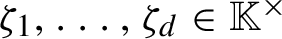 where $\zeta _{1,\sigma },\ldots ,\zeta _{d,\sigma }\in \mathbb {K}_\sigma $ and $\zeta _{\mathbf {n},\sigma }$ denote the image of $\zeta _1,\ldots ,\zeta _d$ respectively of $\zeta _{\mathbf {n}}=\zeta _1^{n_1}\ldots \zeta _d^{n_d}$ in the completion $\mathbb {K}_\sigma $ .