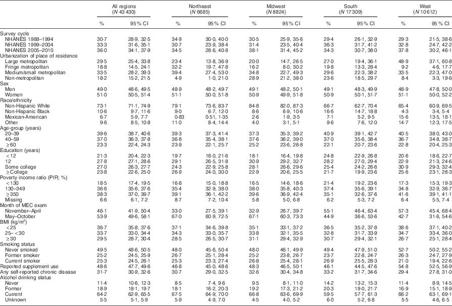 Table 1 Characteristics of adult respondents (weighted percentages and 95 % CI) surveyed in the National Health and Nutrition Examination Survey (NHANES) 1988–1994 to 2009–2010, by US census region