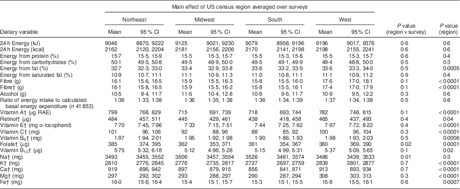 We do not present main effect of survey for several reasons. First, the primary focus of our study is regional differences in dietary and biomarker outcomes. Second, changes in assay methods or laboratory sites for biomarkers, and recall methodology for dietary intakes are confounded with survey effect; however, the methods in each survey were similar for all regions. Moreover, other reports, including a systematic examination by the NCHS, have examined secular trends in nutritional biomarkers and dietary intakes, thus the information is not novel( 39 – Reference Kant and Graubard 41 ).