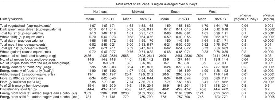 Mean servings of vegetables, fruits, whole fruits, total dairy and whole grains, energy density (kcal/g, kJ/g) of foods, added sugar, g fibre/100 g carbohydrates, g fibre/1000 kcal (4184 kJ), and combined energy from discretionary solid fat, added sugar and alcohol were significantly different among regions (P ≤ 0·001; Table 4). Mean amount or number of all reported foods and beverages, percentage of energy from beverages, grams of discretionary solid fat, and ounce-equivalents of meat and total grains did not differ among regions (P>0·001). Relative to the West and the Northeast regions, in the South and the Midwest regions, the energy density of reported foods, added sugar, and combined energy from solid fats, added sugar and alcohol (nutrient-poor foods) were higher, while g fibre/100 g carbohydrates, g fibre/1000 kcal (4184 kJ), vegetable, fruit and whole grain intakes were lower.
