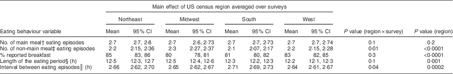 All examined eating behaviours, except the number of main meal eating episodes, were significantly different among regions (P<0·005; Table 5). The South region reported lower mean number of non-main meal eating episodes and longer intervals between eating episodes. Smaller percentages of those in the South and the Midwest reported breakfast. The length of the eating period (difference between the first and the last reported eating episode of the day) was longer in the Northeast and the Midwest relative to the other two regions.