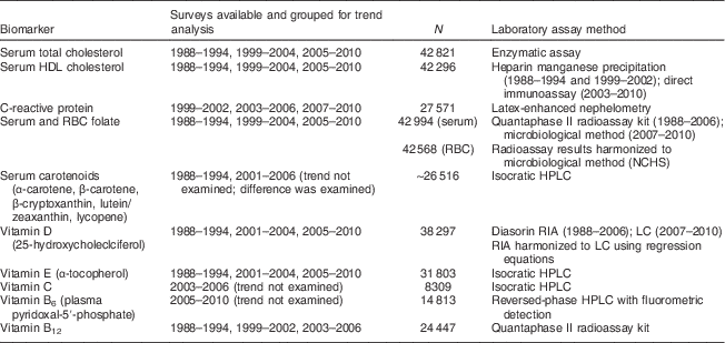 Summary of available nutritional and disease biomarkers and laboratory assay methodology: US adults, National Health and Nutrition Examination Survey (NHANES) 1988–1994 to 1999–2010