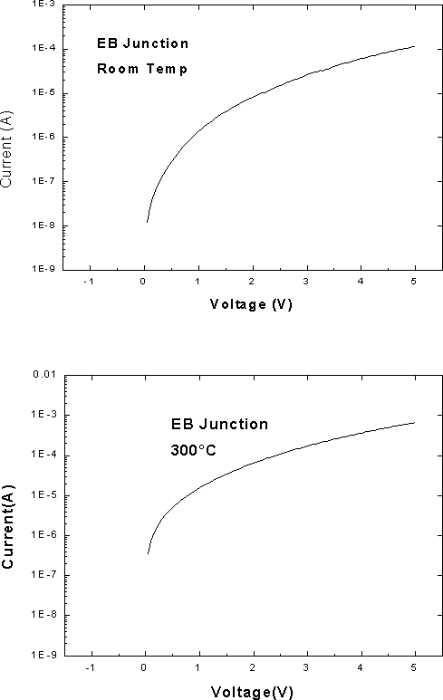 Figure 2. HBT emitter-base junction forward I-V characteristics at 25°C (top) and 300°C (bottom).