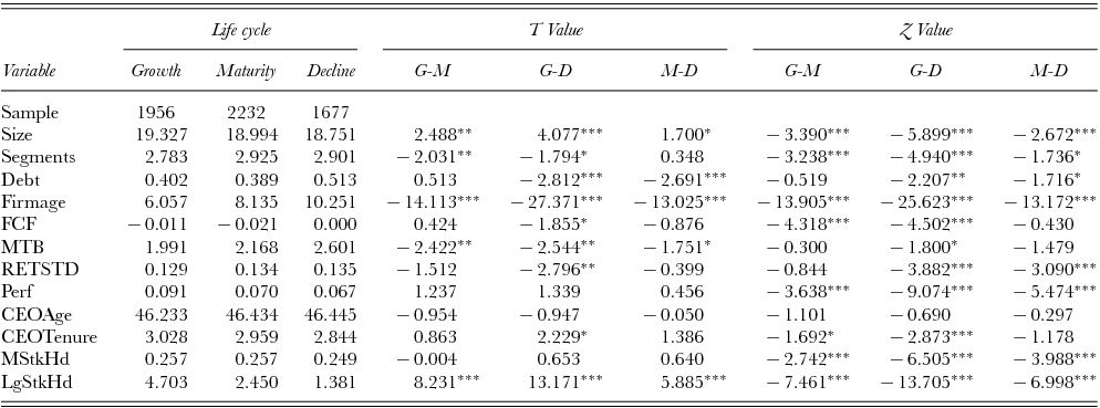 Table 6. Mean difference tests of determinants of board structure by firm life-cycle stages
