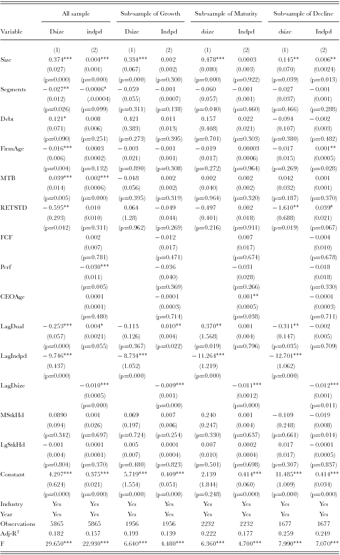Table 6 presents the descriptive statistics of the determinants of boards of directors and their differences in testing outcomes. Board size moves downward with a significant difference between every two stages of firm life cycle. The variable of business segments shows an upward trend, with a significant difference between the growth and maturity stages and between the growth and decline stages. Debt ratio first decreases and then increases, and it is significantly different between the growth and decline stages, and between the maturity and decline stages. Firm age grows larger with a significant difference among every two life-cycle stages. The findings imply that our indicator of a firm's life cycle classification is effective. The firm's free cash flow increases through its life cycle, with an insignificant difference between the growth decline stages. The variable of market-to-book ratio inclines, with a significant difference among every two life cycle stages. The variable of return is more volatile across life cycle, with an insignificant difference over firm life cycle. The difference of firm performance becomes small between the growth and decline stages and the maturity and decline stages with a significant difference. CEO age goes upward through life cycle, with an insignificant difference. CEO tenure is shorter through life cycle, with a significant difference between the growth stage and the decline stage. The variable of managerial stock holdings demonstrates an invert U shape with an insignificant difference among every two life-cycle stages, while the value of the difference of institutional stock holdings is small but with a significant difference among every two-firm life-cycle stages. From the above results, we preliminarily summarize that the effects of board structure change with firm life cycle, and most of the variables are with significant differences over firm life-cycle stages.