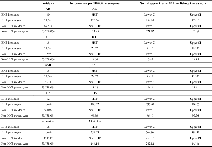 The incidence of stroke was captured using diagnostic codes: ischemic stroke (ICD-10: I63.9), non-traumatic subarachnoid hemorrhage (ICD-10: I60.0), non-traumatic (ICD: I61.9), and TIAs (ICD-10: G45.9).27 All strokes among the HHT patient group were captured in a similar manner and incidence rates per 100,000 person-years calculated for each age group.