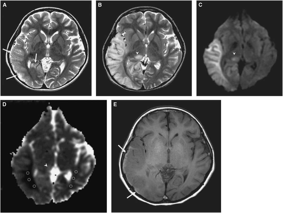 Figure 1 (A) T2-weighted image obtained at day 3 after onset of an SLE shows mild swelling (arrows) of right temporo-occipital lobe. (B) T2-weighted image obtained at day 11 after onset shows progression of edema in the right temporo-occipital lobe and newly appearing thalamic lesion (arrowhead). (C) Hyperintensity of affected areas (arrowhead) on DWI. (D) Hypointensity of the white matter and hyper-/isointensity of the cortex and thalamus on ADC (arrowhead). (E) T1-weighted image shows hyperintense rim (arrows) along cortex of swollen right temporo-occipital lobe, suggesting cortical laminar necrosis. (Reproduced from Kim et al. Korean J Radiol. 2011;12:15-24, with permission.)