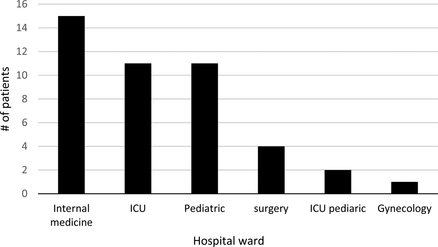 The age of the patients ranged between 3 months and 86 years. Patients were hospitalised in the following departments: internal medicine, intensive care unit (ICU), paediatric, paediatric ICU, surgery and gynaecology (Fig. 1).