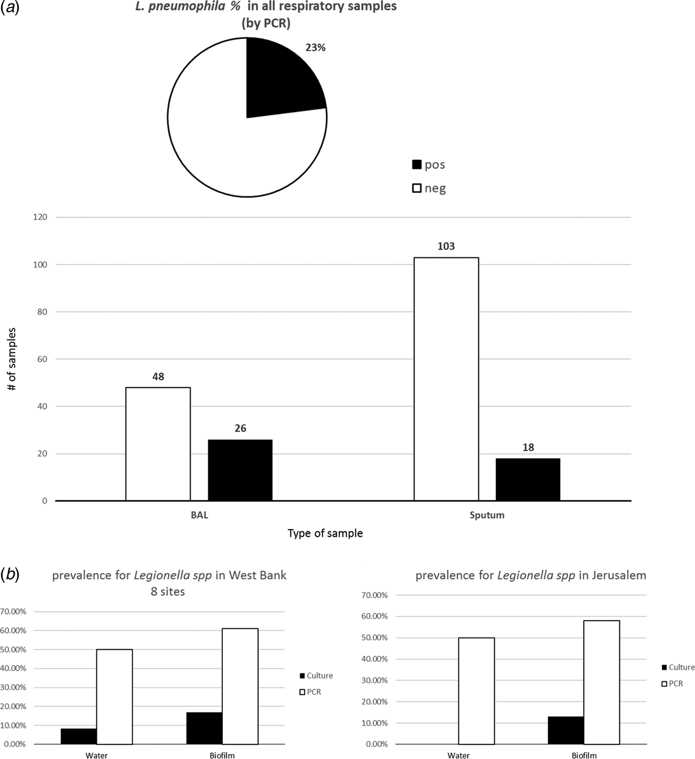 Fig. 2. (a) Prevalence of Legionella pneumophila in the respiratory samples (n = 121) collected from a hospital in Jerusalem as determined by PCR in DNA from BAL and sputum samples. (b) Prevalence of L. pneumophila from environmental samples of West Bank (eight sites) and a hospital in Jerusalem.