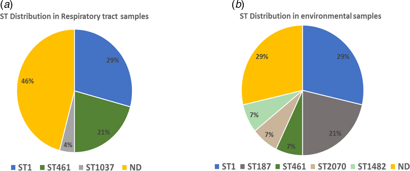 Fig. 3. Sequence types (STs) in clinical and environmental samples. ND = no ST identified. (a) ST distribution in respiratory tract samples. (b) ST distribution in environmental samples.