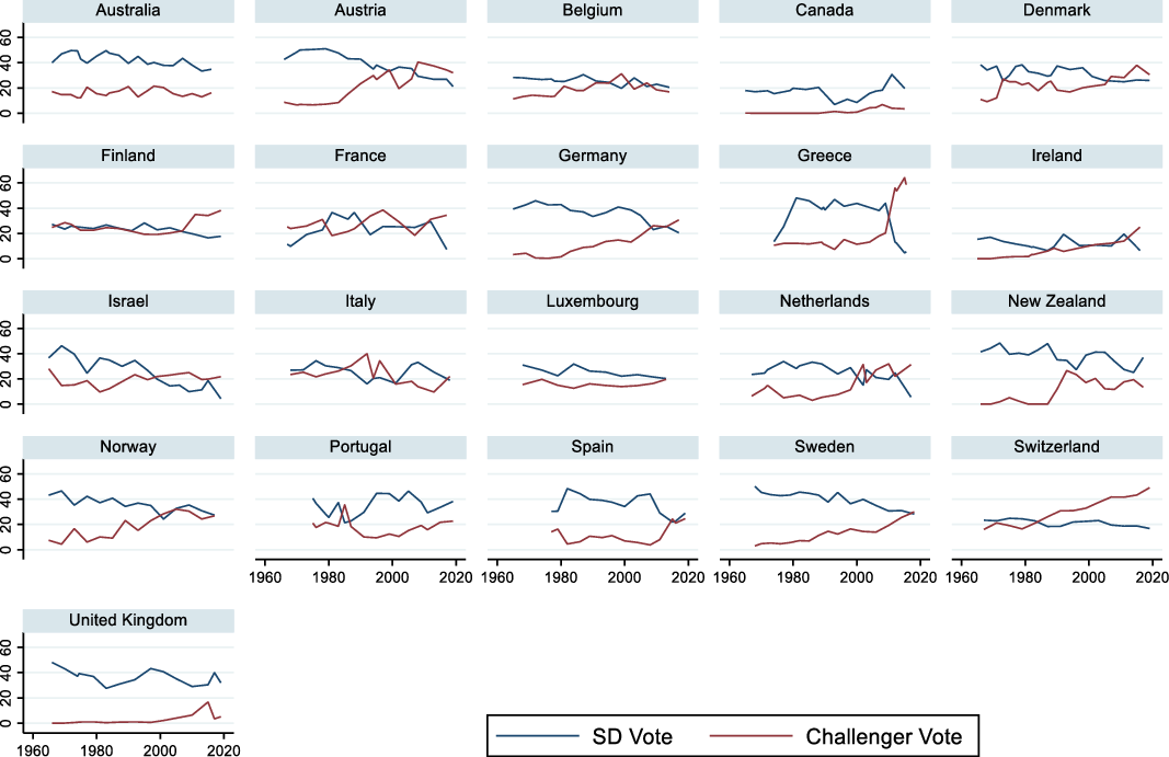 Figure 2. Social democratic vs challenger families vote share by country, 1965–2019.