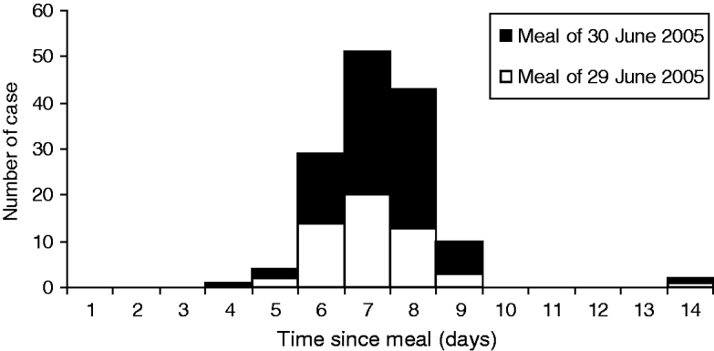 This outbreak occurred in seven groups of workers who ate in a restaurant in June 2005 in the region of Monteregie (Quebec province, Canada). This region has a population of 1 415 000 inhabitants (127·4 persons/km2). Each group worked in a different location and had no other activities in common. A special menu was prepared for the occasion and offered to all groups: fruit cocktail, tomato and bocconcini cheese appetizer, a choice of three entrees (salmon, poultry, pork) served with cooked vegetables, chocolate cake with fresh fruits, tea, coffee and water. The contaminated food was taken at lunch or dinner by 94 and 156 individuals on 29 and 30 June, respectively. A total of 247 adults from the seven groups and three restaurant employees were exposed.