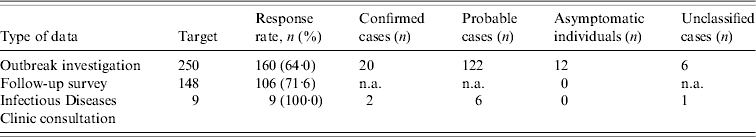 The confirmed, probable and unclassified cases were all included in the follow-up study. However, we did not collect the information required to classify those who returned the questionnaire anonymously. Demographic and clinical characteristics of respondents are shown in Table 3. Symptoms appeared to last longer in those who took antibiotics. The mean duration of diarrhoea for people who took antibiotics was 14·8 days compared to 9·7 days in those who did not (P=0·11). The mean duration of fatigue was 31·5 days for people who took antibiotics compared to 23·1 days for those who did not (P=0·08).