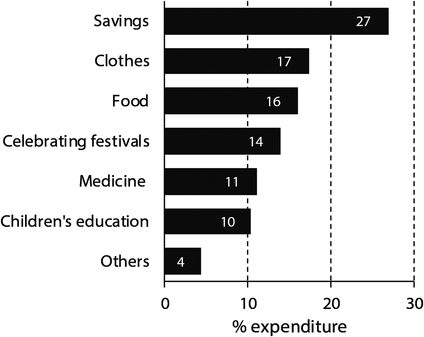 We categorized the reported expenditure of income from yarsagumba as medicine, food, savings, children's education, celebrating festivals, clothes, and other (e.g. electronics, travel, entertainment; Fig. 2). On average, the top three categories of expenditure were clothes (17%), food (16%) and celebrating festivals (14%). Respondents saved 27% of total earnings from yarsagumba harvesting, and > 61% of respondents mentioned that they saved some of the money they earned from yarsagumba harvesting.