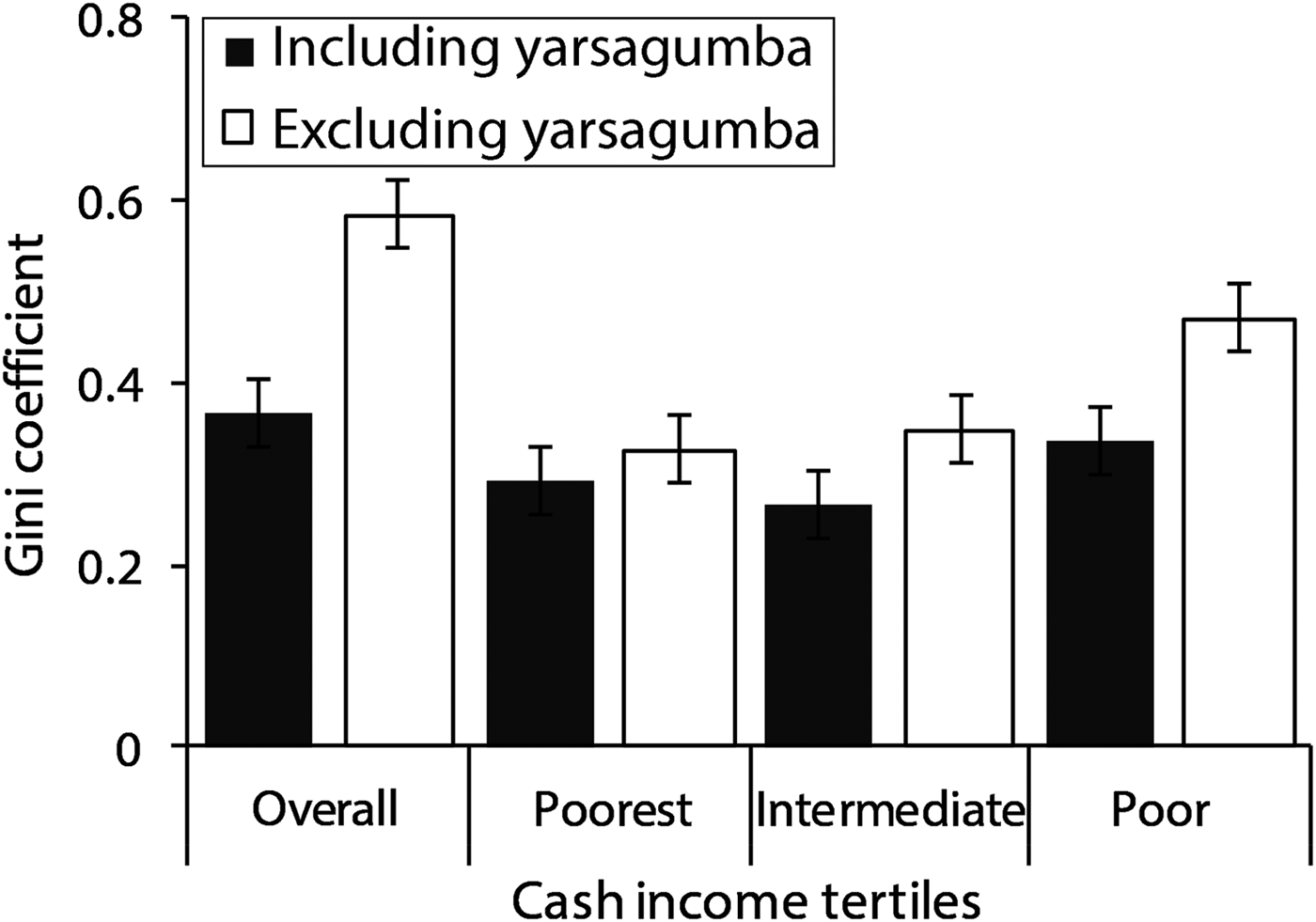 We decomposed the contribution of yarsagumba income to the total Gini coefficient to investigate how this income contributed to overall income inequality. Excluding income from yarsagumba, the income inequality measured by the Gini coefficient was 0.58. With the inclusion of yarsagumba income in the total household cash income, the Gini coefficient decreased to 0.36, indicating the equalizing effect of yarsagumba income on income inequality. The addition of income from yarsagumba harvesting to the household cash income reduced income inequality by 38%. Similar trends were observed among the poorest, intermediate and poor households (Fig. 3). Likewise, the addition of income from yarsagumba to the total cash income reduced the area between the line of equality and the Lorenz curve, which is another indicator of the equalizing effect of yarsagumba income on total income inequality (Fig. 4); the departure from the line of equality was greater when yarsagumba income was removed.