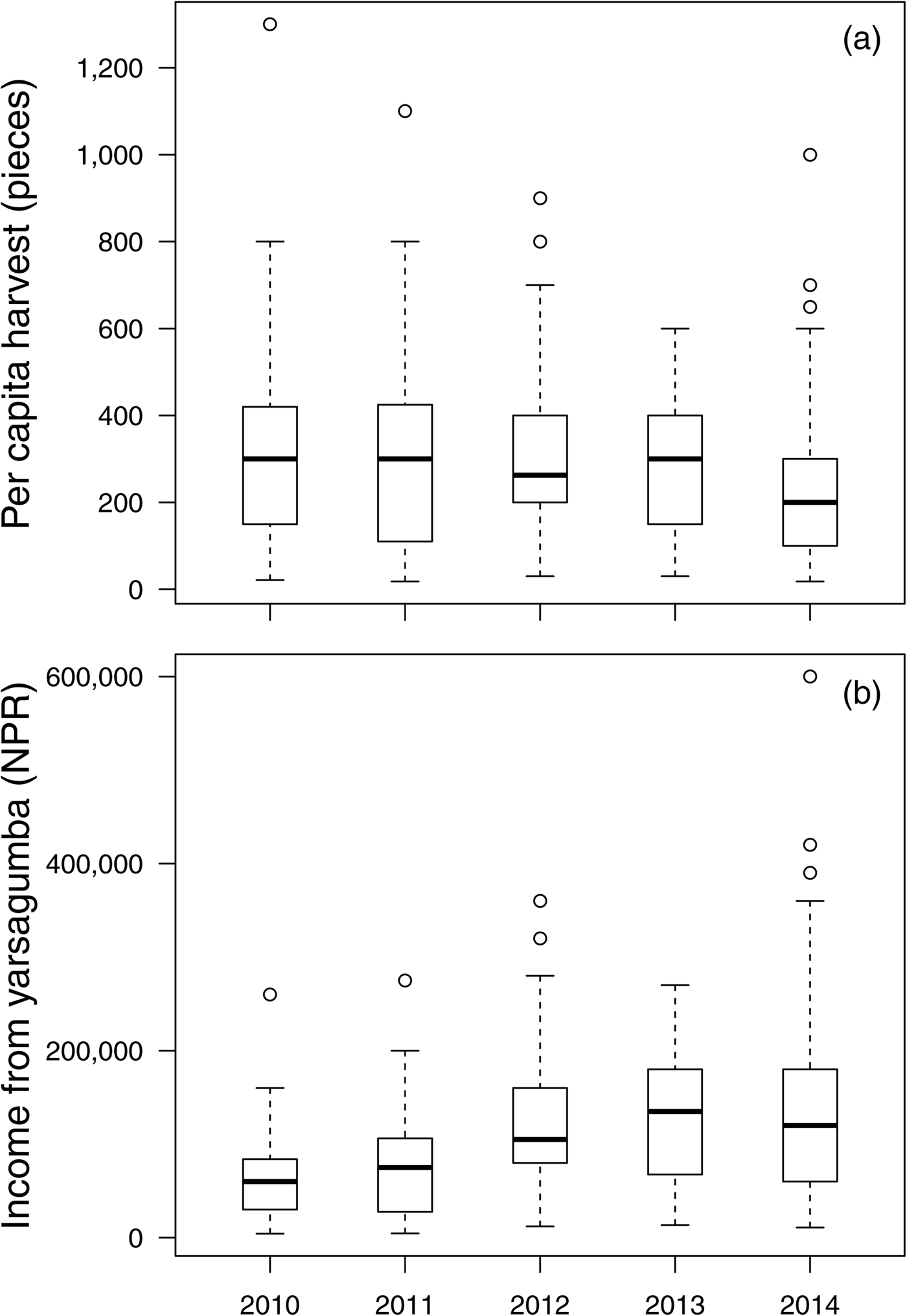 Fig. 5 Box-and-whisker plots of the temporal trend of (a) per capita harvesting of yarsagumba, and (b) the income derived from yarsagumba harvesting by surveyed households in Garjyangkot village, Jumla district, Nepal (Fig. 1) during 2010–2014. The horizontal line within the box indicates the median, the whiskers the maximum and minimum 1.5 interquartile ranges, and the dots outlying values.